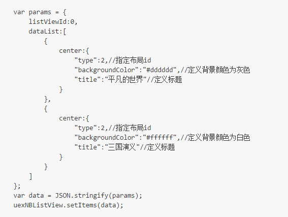 需要动态更新的数据,参考“uexNBListView插件API文档”中的"数据载入方式",定义完整数据变量名称,在接口传入数据时,数据与变量一一对应。