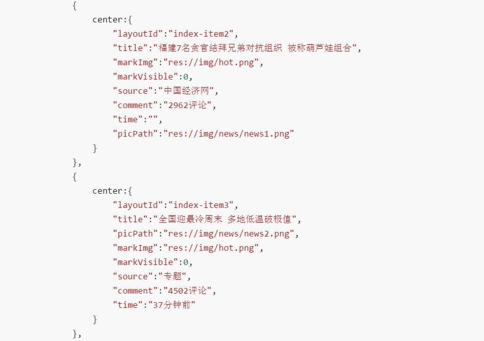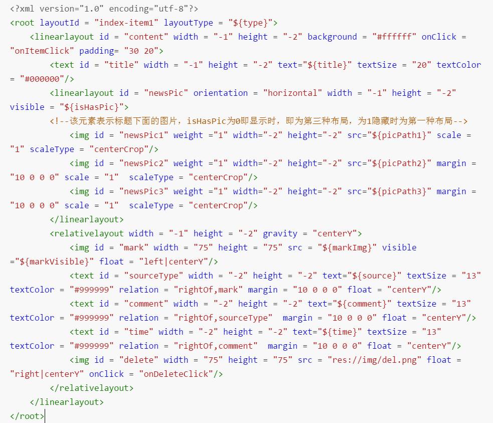 注意:dataList主数据中的键值是与布局文件中定义的变量值相对应的,同时布局文件中定义为形如${XXX}样式的属性变量,必须在接口数据中传入对应的值,否则显示异常。