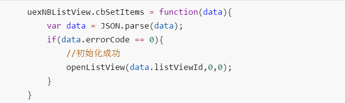 数据设置完成后,在setItems的回调方法cbSetItems中调用打开列表视图方法open,如下: