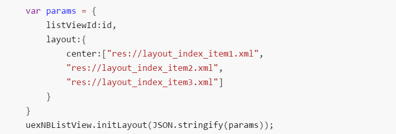 在uexNBListView使用过程中,需要优先调用initLayout初始化布局方法,布局在定义时需要指定哪些数据在列表中是动态的,然后在setItems、insert或者update接口传入相应的数据。