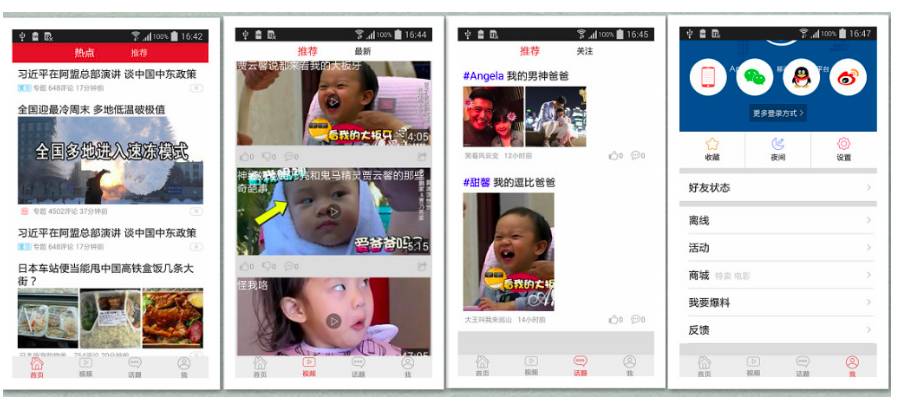 该应用中有四个tab页分别为“首页”、“视频”、“话题”和“我”,通过底部的按钮点击切换。其中“首页”、“视频”和“话题”页都包含头部的导航条,可左右滑动切换页面。而“我”tab页只有单独的一个界面。因此该应用设计为三个容器(分别对应前三个tab页,每个容器中包含两个列表,这两个列表之间通过左右滑动切换),和一个列表(对应“我”tab页)。在底部导航栏点击之后,处理容器或列表的显示及隐藏,来实现tab页的切换效果。