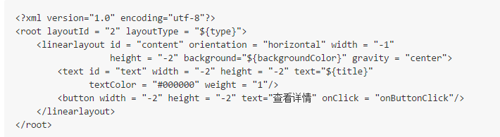 其中根布局linearlayout的背景颜色和text的文本内容需要动态变化,则定义id为content的linearlayout的background属性为 :${自定义变量名} ,这里的"自定义变量名"为backgroundColor。同理定义id为text的text属性为 ${title}。